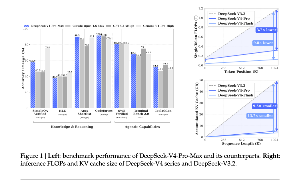 原文第 1 页 Figure 1:左侧是 DeepSeek-V4-Pro-Max 与 Claude、GPT、Gemini 的 benchmark 对比;右侧是 DeepSeek-V4 系列相对 DeepSeek-V3.2 的 inference FLOPs 和 KV cache 变化。