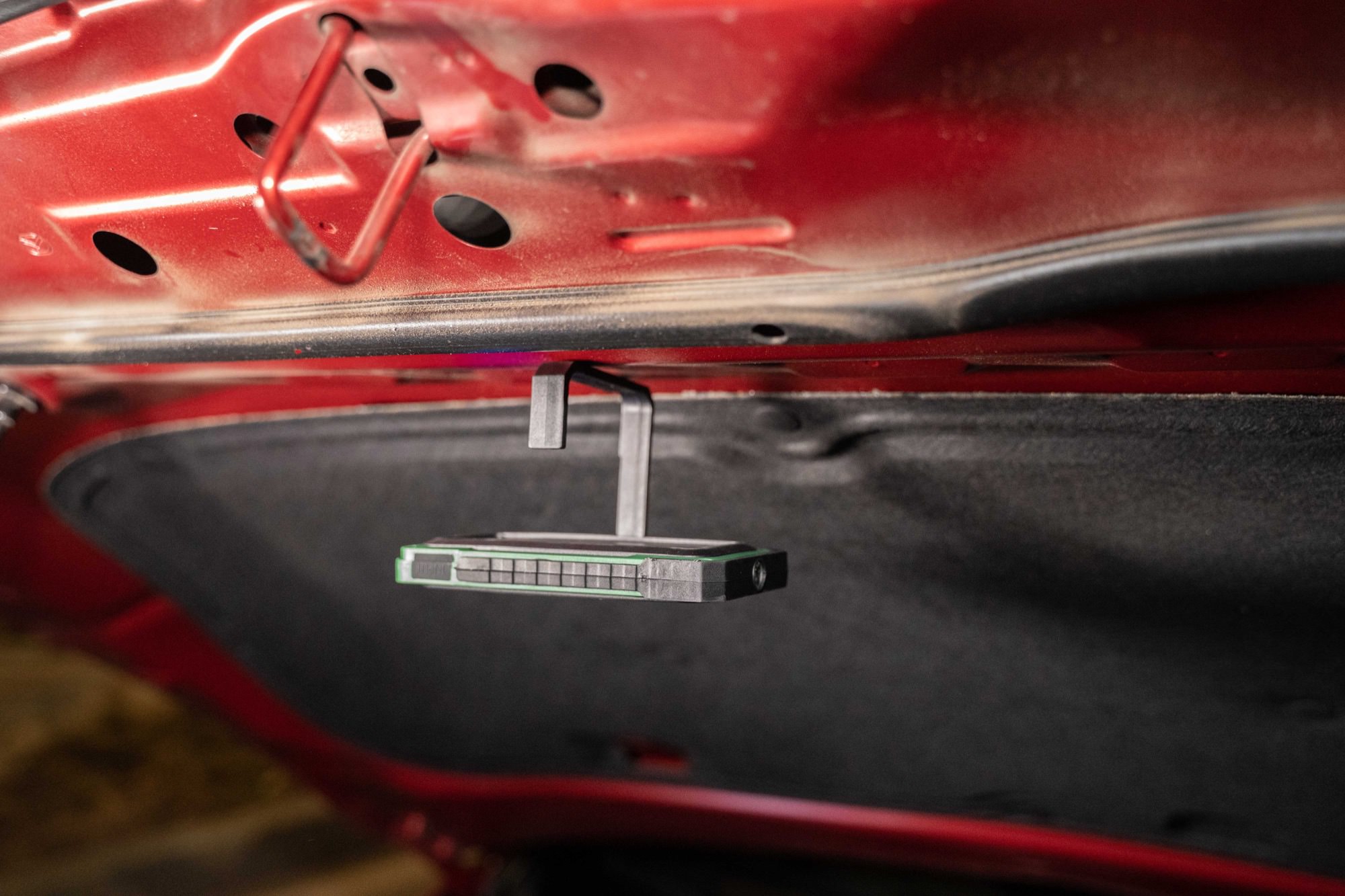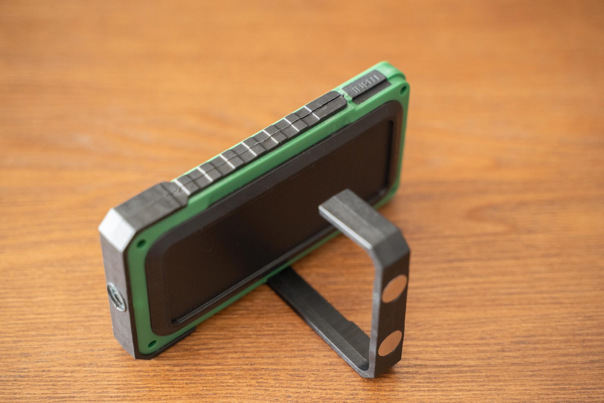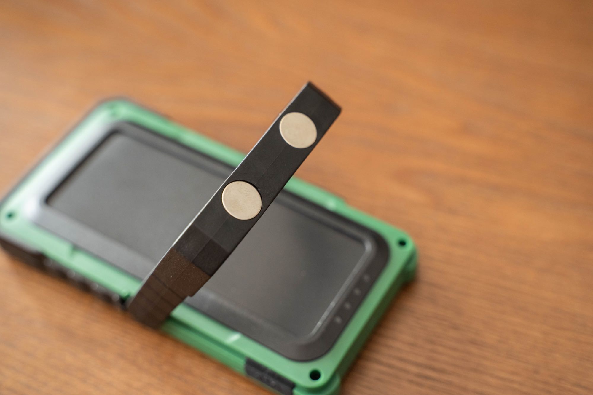 支架背后有一个皮质的线材收纳扣,可以将电源和数据线材穿过去。