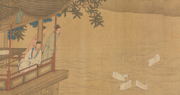 - 兰亭修禊图卷此《兰亭修禊图》卷由清代樊沂绘。画卷描绘了东晋永和九年上巳节,王羲之与名士谢安等人在会稽山阴兰亭举行的雅集与曲水流觞场景。崇山峻岭,溪流蜿蜒,溪畔众多文士或坐或卧,酒觞逐波、谈笑风生。卷末以王羲之水阁观鹅压轴。引首(黃檗悅山)题:飲樂宴。此卷现藏于克利夫兰艺术博物馆。