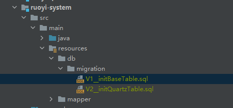 在RuoYi-Vue\ruoyi-system\src\main\resources目录下创建db/migration目录,把若依若依提供的表结构sql文件复制到该文件夹,并且重命名。