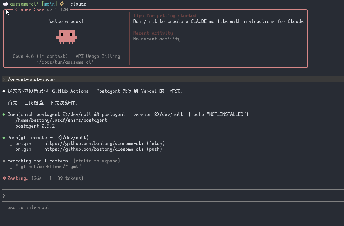 安装完成后,直接使用 claude 打开你的项目,并输入 /vercel-seat-saver 来唤起 vercel seat saver.
