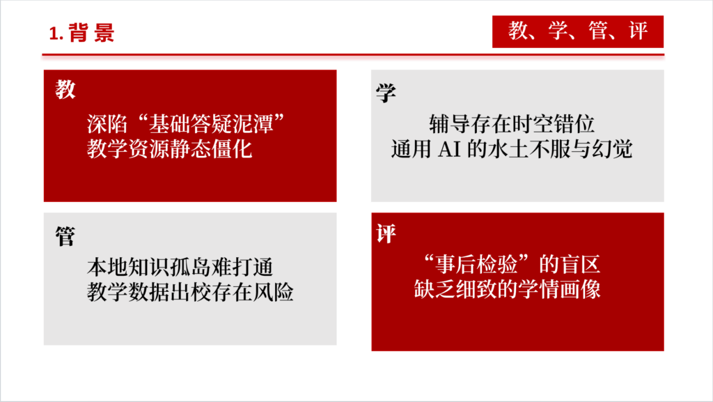 当天晚上,那位同学找我,我们和另外一位同学沟通一些想法,初步确定往“教-学-管-评”智能体方向去做,设计一个平台来服务教育教学。